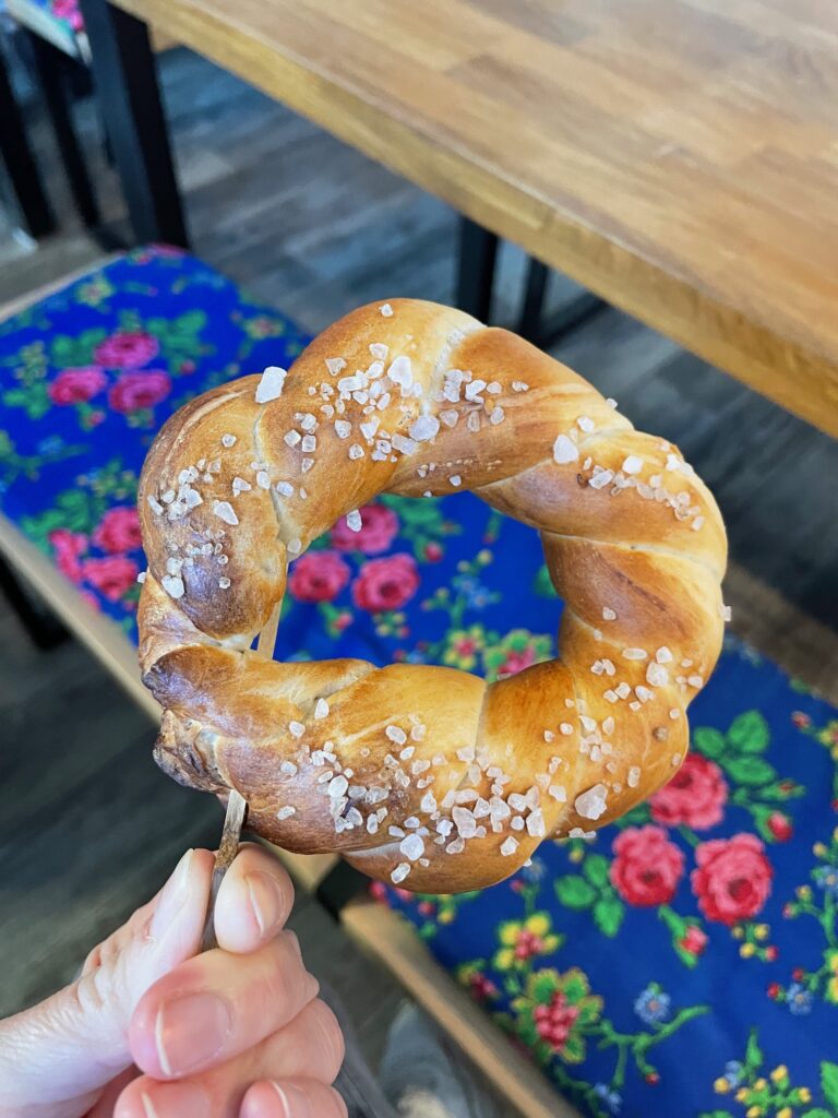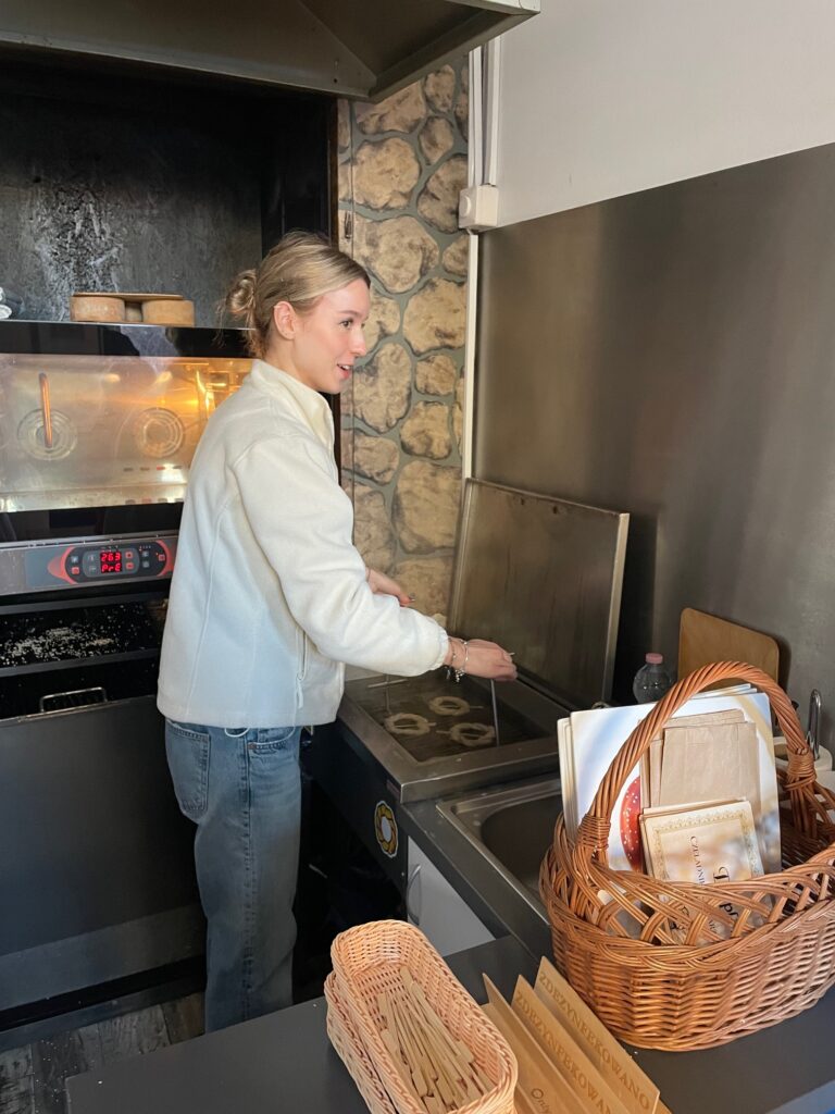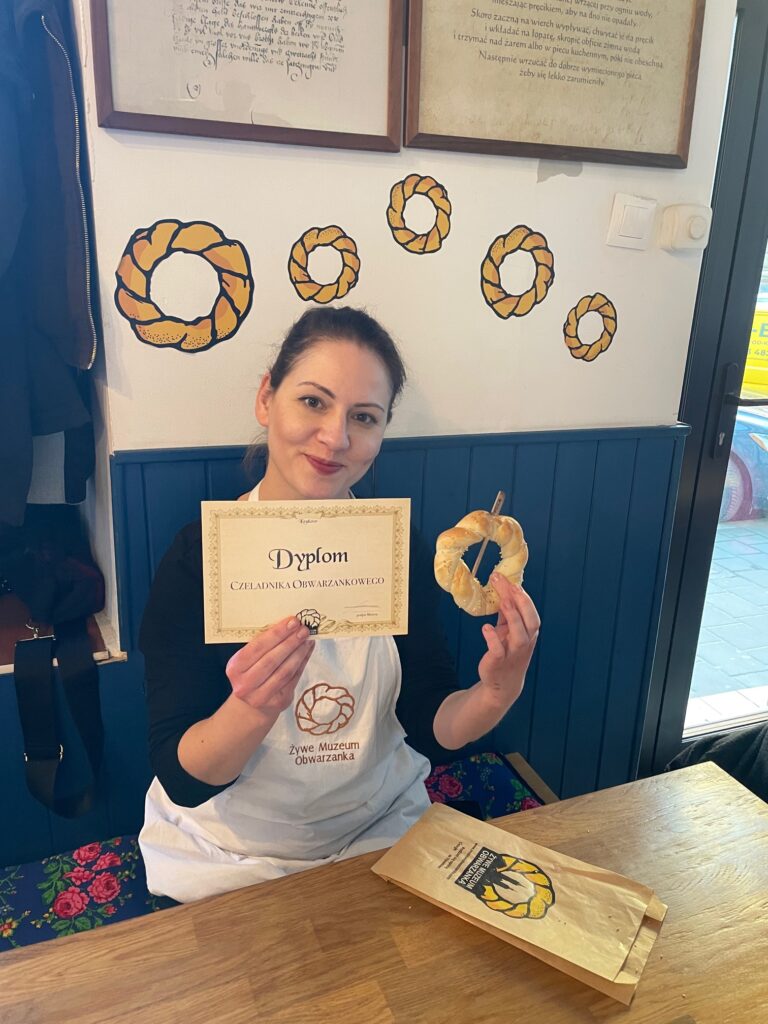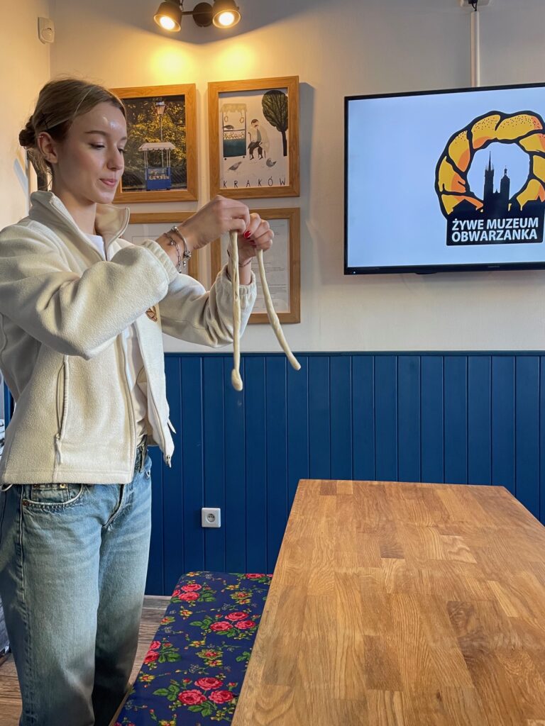 Najwięcej radości przyniosła jednak część praktyczna – każdy z uczestników mógł własnoręcznie przygotować swojego obwarzanka. Po chwili trafił on do pieca, a my mogliśmy zabrać ze sobą gorącą, pachnącą pamiątkę spotkania.