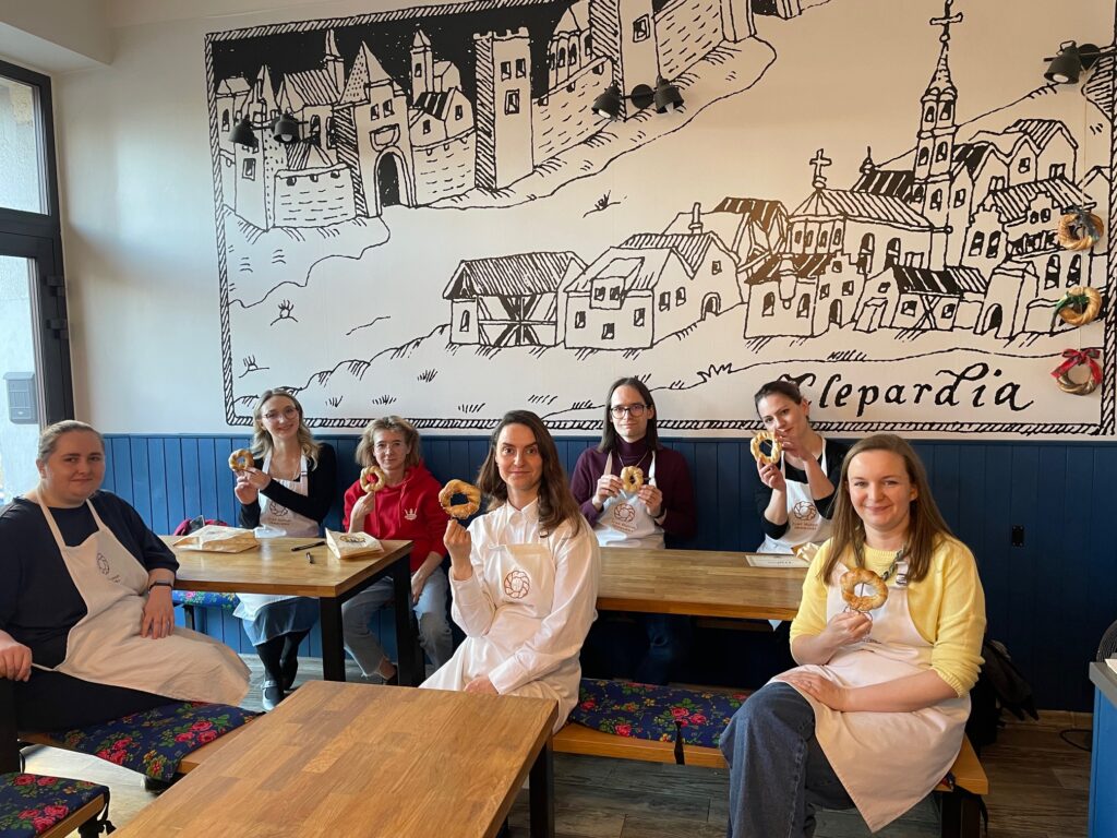 Ostatnie spotkanie naszego zespołu (06.03.2026r.) spędziliśmy w wyjątkowym miejscu – w Muzeum Obwarzanka w Krakowie. Podczas warsztatów mieliśmy okazję poznać ponad 600-letnią historię obwarzanka, jednego z najbardziej charakterystycznych symboli miasta. Dowiedzieliśmy się, jak wygląda tradycyjny proces jego powstawania oraz jakie sekrety kryją się za tym pozornie prostym wypiekiem.