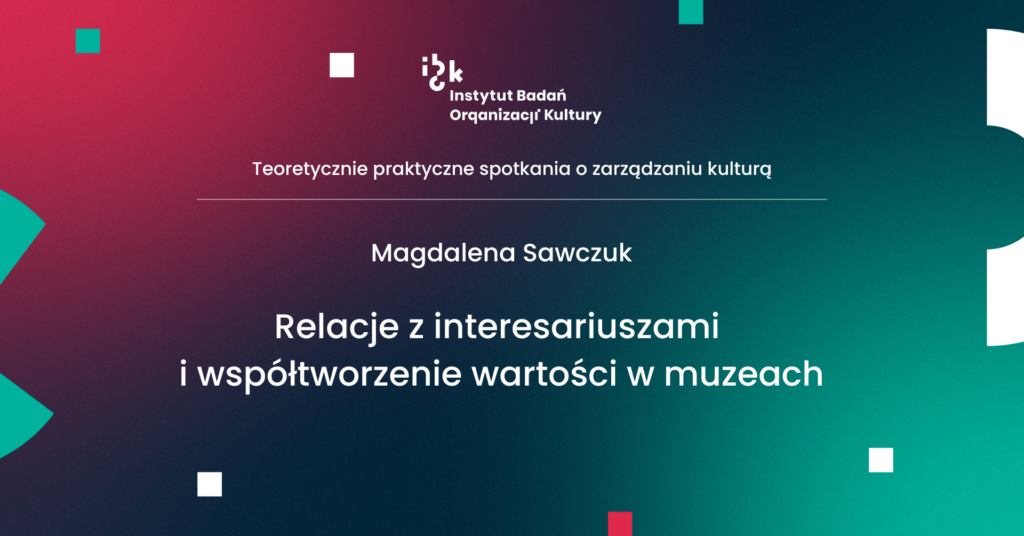 W czasie webinaru przyjrzymy się temu, jak zarządzanie relacjami z interesariuszami muzeów jest powiązane z procesami współtworzenia wartości. O ile bowiem wskazuje się, że relacje to istotny zasób organizacji kultury, tak – ze względu na swoją dynamikę i złożoność – nadal jest to obszar nie w pełni zbadany. Sama wartość też częściej bywa badana w odniesieniu jedynie do osób odwiedzających. W trakcie webinaru zostaną przedstawione wyniki badań dotyczące dynamiki istotności interesariuszy, etapów zarządzania relacjami oraz powiązania tego procesu ze współtworzeniem wartości. Zaprezentowane informacje mają znaczenie tak dla teorii, jak i dla praktyki zarządzania instytucjami muzealnymi.