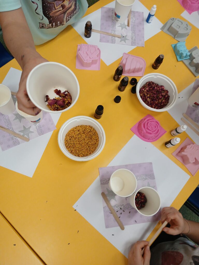 poznanie zapachów dodatków mydlarskich (płatki róż, lawenda, olejki zapachowe). Po